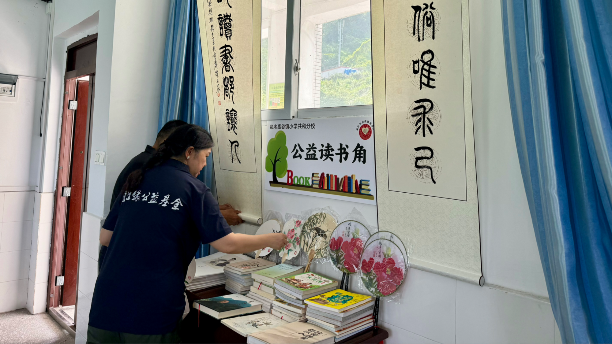 工作人员为校园教室布置公益读书角(受访方供图)