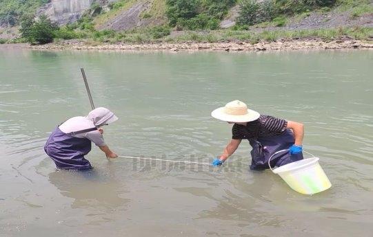 河边没有树荫遮挡,阳光直直地裹在身上,工作人员刚蹲下身子,额角的汗珠就顺着脸颊往下滚。他们先将采样瓶在水里清涮几遍,采样网在清水中仔细涮洗,再顺着水流缓缓探入水下,动作轻得像怕惊扰了水里的小生物,提起网时又格外稳,生怕漏过任何一份有效样本。选好的鱼虾、螺类被小心放进装有固定剂原河水的容器中。挖底泥时将采样器慢慢放进水里,等它稳稳扎在泥里再提上来,尽量保持底泥的原样。